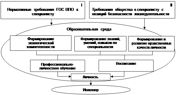 Решение государственной проблемы сохранения здоровья и жизни российских граждан возможно, на наш взгляд, частично решить за счет формирования экологической компетентности будущего инженера, которая выступает как характеристика личности инженера, выраженная в единстве его теоретических знаний, практической подготовленности, способности и готовности осуществлять все виды своей профессиональной деятельности, которые удовлетворяют заданным требованиям производства и охраны труда, обеспечивают необходимый уровень здоровья, безопасность жизнедеятельности человека и экологическую безопасность среды обитания.