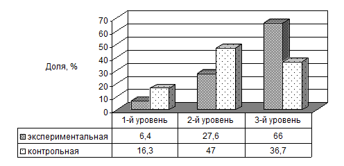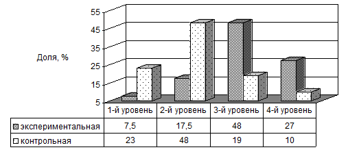 II группа (рис. 6) включала четыре уровня сформированности экологической компетентности: 1-й уровень – уровень оперирования необходимой информацией, взаимосвязи отдельных специальных технических факторов; 2-й уровень – уровень определения оптимального решения, поисковый, уровень устойчивых операций; 3-й уровень – самостоятельное моделирование и прогнозирование ситуации, аналитико-синтезирующий уровень; 4-й уровень – создание качественно новых технических продуктов, уровень творчества.