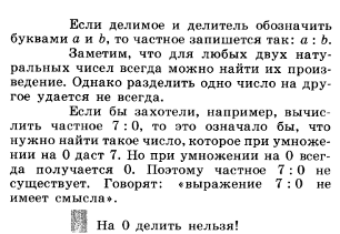 Пример обоснования этого факта из учебника Дорофеева: «Если бы захотели, например, найти частное 7:0, то это означало бы, что нужно найти такое число, которое при умножении на 0 даст 7. Но при умножении на 0 всегда получается 0. Поэтому частное 7:0 не существует. Говорят: «выражение 7:0 не имеет смысла».