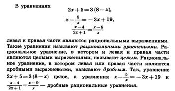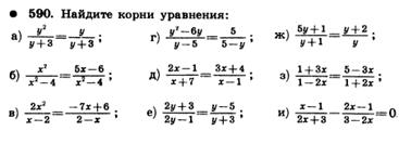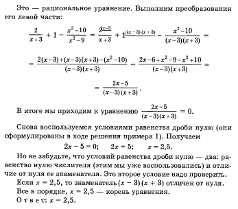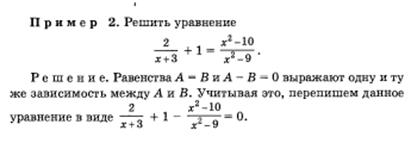 При решении уравнения вида r(х) = р(х), где r(х) и р(х) — рациональные выражения, можно не сводить его к уравнению r(х) — р(х) = 0, а представить выражения r(х) и р(х) в виде дробей с одинаковыми знаменателями. Если при этом не выполнялись тождественные преобразования, которые могут привести к нарушению равносильности, то получится уравнение вида