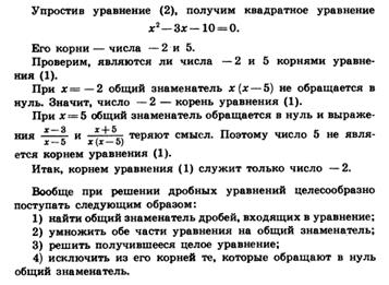 С указанными способами решения уравнений вида r(х) = р(х), где r(х) или р(х) — рациональные выражения, хотя бы одно из которых дробное (так называемых уравнений с переменной в знаменателе дроби), учащиеся знакомятся в курсе алгебры VII класса.