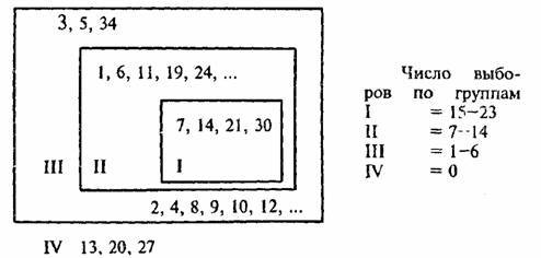 В центральном вписанном прямоугольнике располагаются фамилии лиц, получивших максимальное количество положительных выборов. Второй прямоугольник содержит фамилии лиц с меньшим числом выборов. Третий — с минимальным. И за пределами прямоугольников записываются фамилии испытуемых, не получивших ни одного выбора. Используется также и социосхема взаимного притяжения и предпочтений партнеров в коллективе, Если для расчета индекса и построения социограммы испытуемые не указывают себя на листках опроса ("с кем бы вы хотели жить в одном доме, выполнять творческое задание, участвовать в походе и т.д."), то для построения социосхемы испытуемые указывают себя в опросном листке и таким образом исследователь получает возможность выявить, зафиксировать линии взаимных притяжений и отталкиваний.