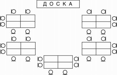 Групповая работа детей требует перестановки парт. Для пар удобны обычные ряды. Для работы тройками, а тем более четверками парты надо ставить так, чтобы детям, работающим вместе, удобно было смотреть друг на друга: