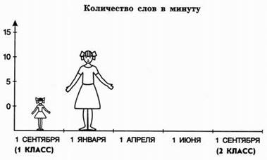 Если ребенок пришел в класс читающим, к примеру, 10 слов в минуту, то шкалу «Число слов в минуту» надо начинать не с нуля, а с отметки 10 (или 5). Праздник читательского роста, следующий за проверкой скорости чтения, не стоит омрачать антипедагогичным: «Петров читает уже 60 слов в минуту, а Васильев только 20». Гораздо объективнее детский прогресс будет виден, если сказать: «И Вадик Петров, и Миша Васильев отлично потрудились на уроках чтения. Оба стали вдвое выше».