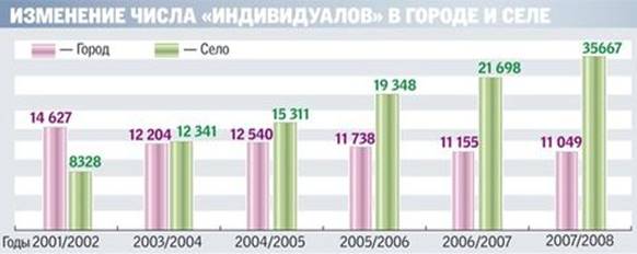Як видно з діаграми, співвідношення «індивідуальників» в місті і селі за шість років змінилося з точністю до навпаки. В МОН пояснюють це різким скороченням населення сіл і некомплектністю класів, отчого дітей доводиться учити бути індивідуальне.
