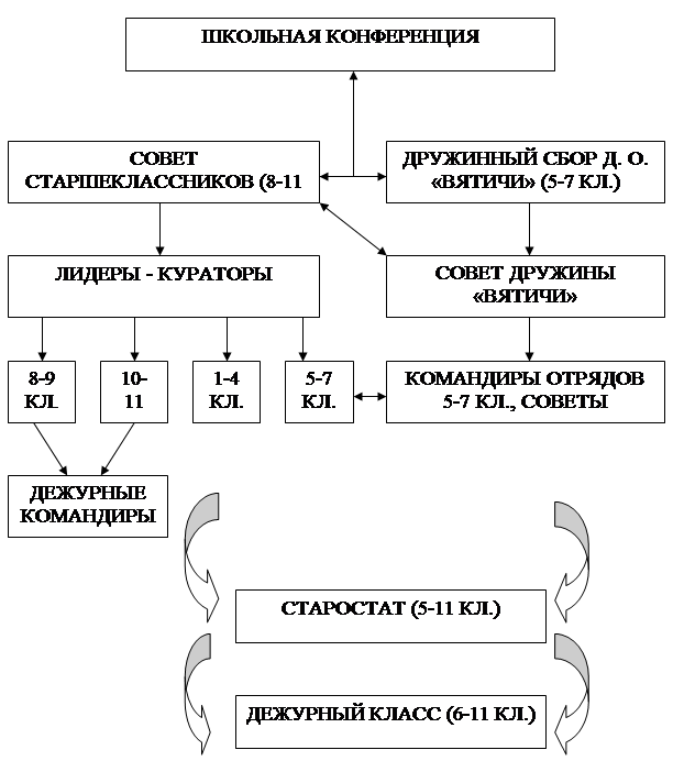 В демократизирующейся школе каждый из коллективов и объединений взрослых и детей должен иметь право на самоуправление, самостоятельное решение своих вопросов, удовлетворение потребностей и интересов в образовательном процессе. Этому могут служить их раздельные органы самоуправления: педагогического коллектива – педагогический совет (высший орган самоуправления педагогов в школе), методический совет, методические объединения учителей, воспитателей, классных руководителей, малые педсоветы, психолого-педагогические консилиумы, правовая, аттестационная и другие комиссии педагогов; самоуправление ученического коллектива – собрание учащихся школы (высший орган их самоуправления в школе); школьная ученическая конференция, являющаяся высшим органом ученического самоуправления в школе, не имеющей условий для работы школьного ученического собрания; избранный школьным ученическим собранием или конференцией совет учащихся, ученический комитет школы, его комиссии, штабы и другие рабочие органы самоуправления; классные собрания учащихся, классные ученические советы и их рабочие органы; ассоциации родителей школы – школьное родительское собрание (высший орган самоуправления в школе); школьная ученическая конференция, являющаяся высшим органом ученического самоуправления в школе, не имеющей условий для работы школьного родительского собрания; избранный школьным родительским собранием или конференцией родительский комитет школы, его секции, комиссии; классные родительские комитеты и их рабочие органы [Бочкарев, 56].