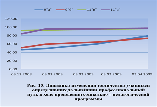 Второй этап (с 1.11.08 по 1.12.08) связан с осуществлением основной социально-педагогической работы по теме «Особенности социально-педагогической поддержки профессионального самоопределения старших школьников».