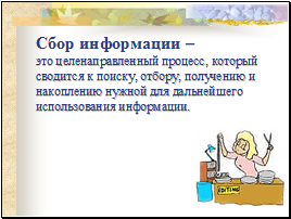 В процессе поиска вам может встретиться самая разная информация. Любую информацию человек привык оценивать по степени ее полезности, актуальности и достоверности. После оценки какие-то полученные сведения могут быть отброшены как ненужные, какие-то, наоборот, оставлены на долгое хранение. То есть процесс поиска информации практически всегда сопровождается ее отбором . Всё это вместе называют процессом сбора информации.