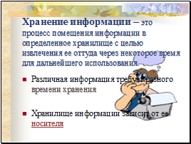 Хранение информации — процесс такой же древний, как и существование человеческой цивилизации. Он имеет огромное значение для обеспечения поступательного развития человеческого общества (да и любой системы), многократного использования информации, передачи накапливаемого знания последующим поколениям.