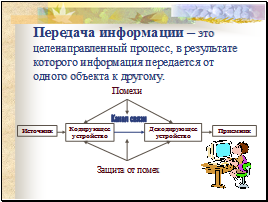 В процессе передачи информации обязательно участвуют источник и приёмник информации: первый передает информацию, второй её принимает. Между ними действует канал передачи информации — канал связи . Передача информации возможна с помощью любого языка кодирования информации, понятного как источнику, так и приёмнику.