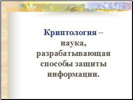 В процессе передачи информация может теряться и искажаться: искажение звука в телефоне, атмосферные помехи, влияющие на работу радиоприёмника, искажение или затемнение изображения в телевизоре, ошибки при передаче по телеграфу. Эти помехи, или, как их называют специалисты, шумы, искажают информацию. К счастью, существует наука, разрабатывающая способы защиты информации — криптология (слайд 9), широко применяющаяся в теории связи.