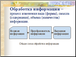 Обрабатывать можно информацию любого вида, и правила обработки могут быть самыми разнообразными. Общая схема обработки информации имеет вид, представленный на слайде 10.