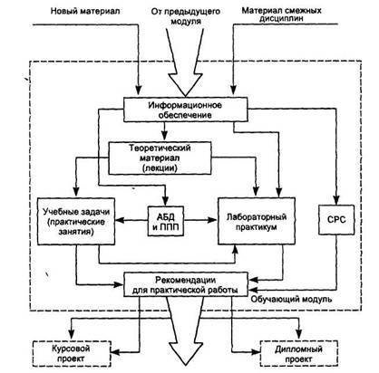 и учебно-профессиональной (деятельностной) частях модуля. Задача первой — формирование теоретических знаний, функции второй — формирование профессиональных умений и навыков на основе приобретенных знаний. В качестве информационных модулей могут быть взяты как целые дисциплины, так и некоторые разделы дисциплин, спецкурсы, факультативы. Деятельностным