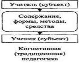 Как видно, в когнитивной педагогике общение осуществляется через содержание, формы, методы и средства. В личностно-ориентированном обучении есть непосредственное взаимодействие между учителем и учеником, которое направлено на овладение материалом с помощью форм, методов и средств.