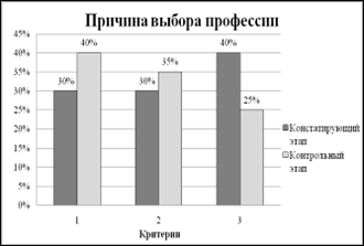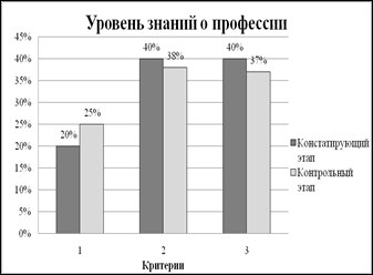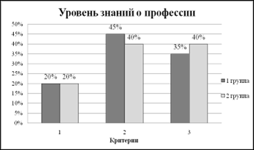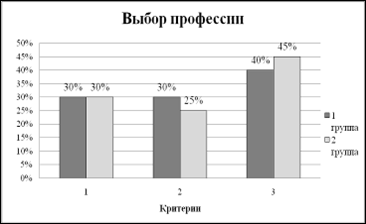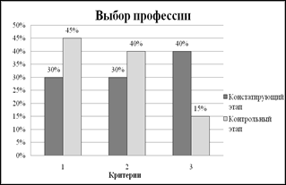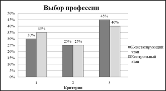 На констатирующем этапе с помощью анкетирования были получены данные, которые свидетельствуют о низком уровне профессиональной ориентации старшеклассников: многие еще не выбрали себе профессию, а из тех, кто выбрал, большинство мало или вовсе не знают о ней, о том, где и как ее можно получить. Необходимо также отметить, что многие ребята выбрали профессию исходя не из интереса к той или иной деятельности, а по причине только лишь престижности профессии или желания родителей продолжать семейную традицию. Все это подтвердило необходимость проведения профориентационных работ среди старшеклассников. Для следующих этапов эксперимента были сформированы две группы старшеклассников: экспериментальная и контрольная. Группы были организованы таким образом, чтобы результаты анкетирования были примерно одинаковые.