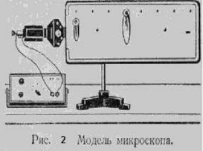 малую собирающую линзу с фокусным расстоянием 70 мм, служащую объективом микроскопа. На нее с помощью поворотных зеркал направляют две пары узких пучков света, каждый из которых выходит из одной точки (точки пересечения перед линзой). Наблюдают пересечение этих лучей после прохождения линзы. Затем устанавливают вторую линзу с фокусным расстоянием 140 мм, которая выполняет роль окуляра микроскопа. После прохождения окуляра лучи расходятся, их продолжения дают мнимые изображения первоначальных точек. Обращают внимание учащихся на то, что окуляр действует так же, как и обычная лупа.