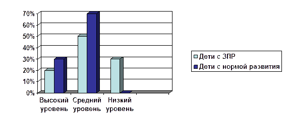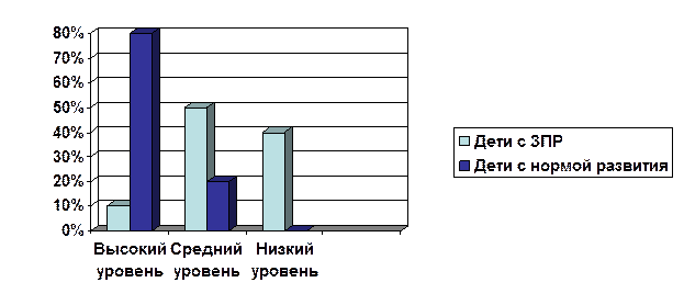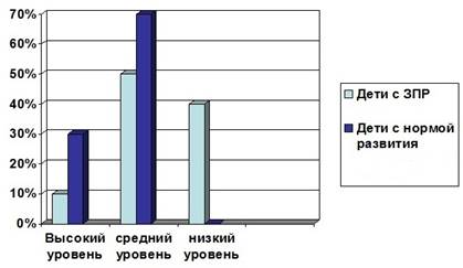 У детей этой группы недостаточно сформированы и пространственные представления: ориентировка в направлениях пространства в продолжение довольно длительного периода осуществляется на уровне практических действий; часто возникают трудности при пространственном анализе и синтезе ситуации. Поскольку развитие пространственных представлений тесно связано со становлением конструктивного мышления, то и формирование представлений данного вида у детей с ЗПР также имеет свои особенности. Например, при складывании сложных геометрических фигур и узоров дети с ЗПР часто не могут осуществить полноценный анализ формы, установить симметричность, тождественность частей конструируемых фигур, расположить конструкцию на плоскости, соединить её в единое целое. В то же время, в отличие от умственно отсталых, дети рассматриваемой категории относительно простые узоры выполняют правильно. [3]