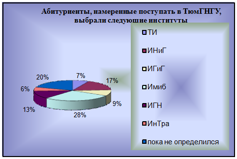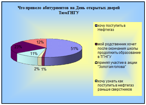 Самой обширной аудиторией потребителей образовательных услуг тюменских вузов являются учащиеся 11 классов. С целью выяснения мотивов поступления в ТюмГНГУ, а также общих тенденций в выборе специальности, 26 ноября 2006г. на Дне открытых дверей был проведен социологический опрос школьников тюменских образовательных учреждений. В опросе приняло участие 227 человек. Из числа опрошенных 4 % в возрасте 14 лет, 15 % - 15 лет, 58 % - 16 лет, 21 % - 17 лет, 2 % - 18 лет. Большинство пришедших на День открытых дверей узнали об этом мероприятии, получив открытку с приглашением или увидев плакат в школе.