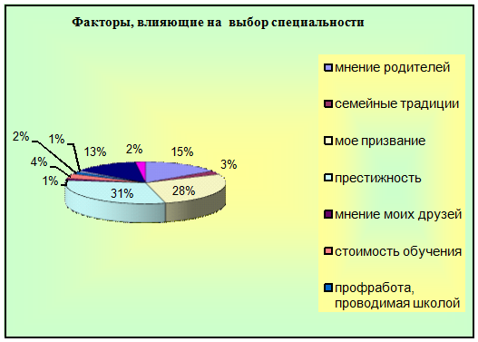 Для выявления определяющего фактора выбора специальности старшеклассникам был задан вопрос «Что повлияло на выбор специальности?». Для школьников решающим фактором при выборе специальности является ее престижность (30 %) и собственное призвание (28 %). Рекомендации родителей также оказывают влияние на выбор старшеклассников при поступлении, в какое либо учебное заведение –16 %. Для 13 % опрошенных определяющим фактором является гарантия трудоустройства.