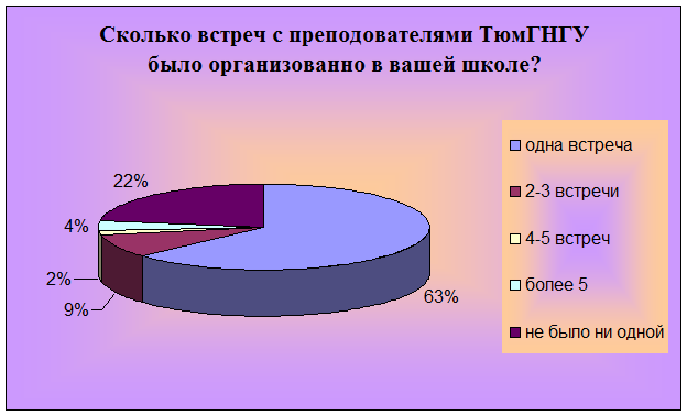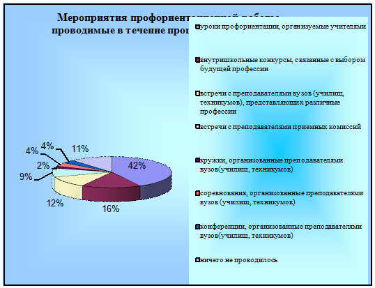 Как показало исследование на сегодняшний день самым распространенным мероприятием профориентационной работы являются уроки профориентации в школе, а также внутришкольные конкурсы связанные с выбором профессии. Немаловажное значение имеют встречи с преподавателями вузов, представляющих различные профессии и специальности, и встречи с представителями приемной комиссии.