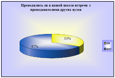 | встречи с преподавателями вузов (училищ, техникумов), представляющих различные профессии | 31 | 12 |