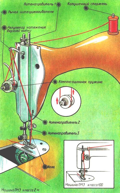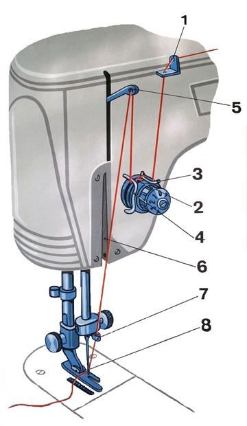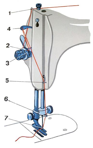 Нить от катушки проводят через верхний нитенаправитель к регулятору натяжения верхней нити. Пропускать нитенаправитель нельзя, потому что нить должна войти в регулятор натяжения под определенным углом.