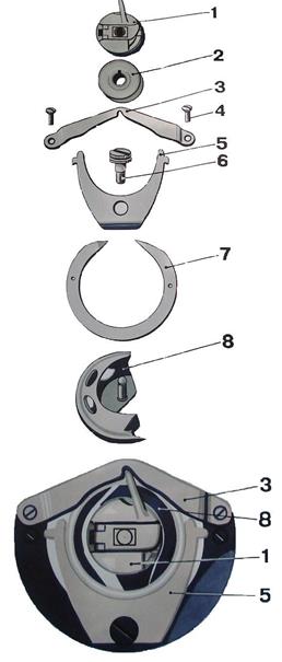 ШК предназначен для того, чтобы разместить шпульку с ниткой внутри челночного механизма и обеспечить свободный выход из него нижней нитки. ШК представляет собой металлическую чашечку, на боковой поверхности которой имеется косая прорезь для нитки, а внутри шпиндель, на который надевается шпулька.