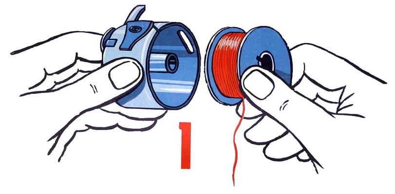 - Потяните за конец нити и убедитесь в том, что нить выходит из ШК с небольшим усилием, шпулька вращается свободно, не заедает.