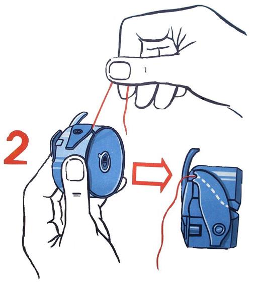 - Возьмите ШК в левую руку и вставьте в него шпульку с нитью: Шпульку нужно держать таким образом, чтобы нить свешивалась в направлении, противоположном направлению косой прорези и чтобы конец нити располагался ближе к внутренней щечке шпульки. Это облегчает заправку нити.