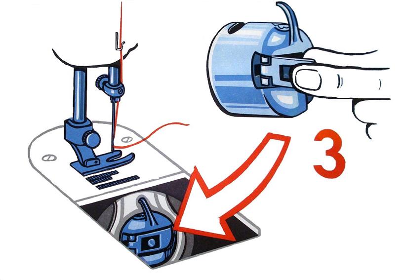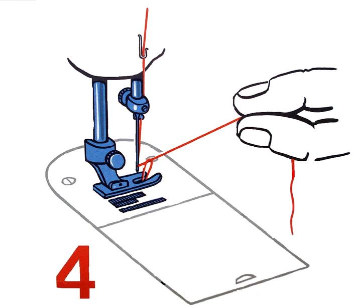 После заправки верхней нити следует вытянуть наверх нижнюю нить из ШК (конечно, если он уже установлен). Для этого, придерживая левой рукой конец нити из ушка иглы, но не натягивая нить, поворачивают на себя маховое колесо , чтобы игла с нитью сначала опустилась в отверстие игольной пластины, захватила там нить, выходящую из ШК, а затем опять поднялась в свое верхнее положение. После этого нужно потянуть за конец верхнюю нить и через отверстие в игольной пластине вытянуть нижнюю наверх . Концы обеих нитей вытягивают на 7-8 см и укладывают под прижимную лапку . На этом подготовка машины к шитью заканчивается.