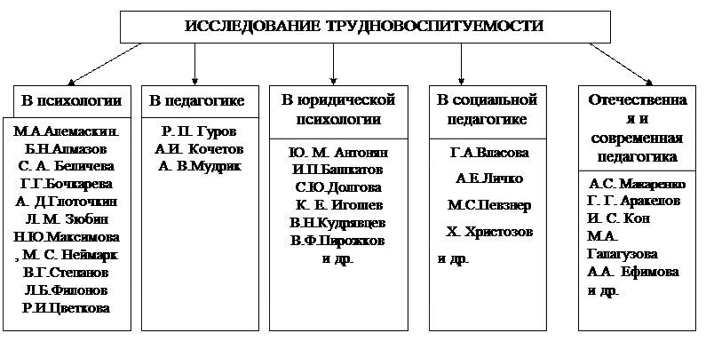 · В социальной педагогике: Г.А.Власова, В.Л.Гиндинкин, А.Е.Личко. М.С.Певзнер, Х. Христозов. (Схема №1)