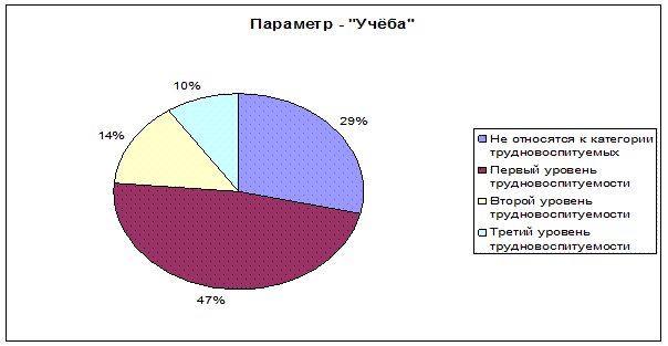 Результаты анкетирования по параметрам показывают, что по параметру «учёба» 29% учащихся не относятся к категории трудновоспитуемых, 47% имеют первый уровень трудновоспитуемости (отдельные пробелы в общем развитии успеваемость удовлетворительная), 14% имеют второй уровень трудновоспитуемости (негативное отношение к школе, проблемами в умственном развитии), 10% учащихся имеют третий уровень трудновоспитуемости (негативное отношение к школе, к сверстникам, к нормам морали; пробелы в умственном, нравственном, волевом развитии).