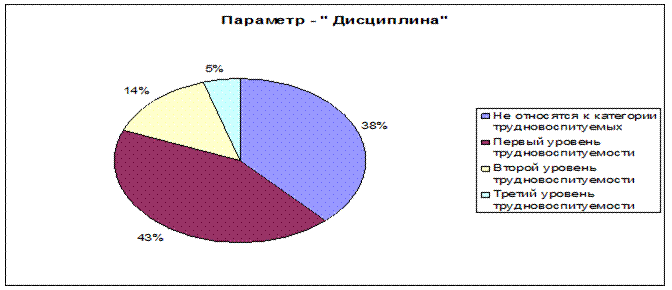 По параметру «дисциплина» 38% учащихся не относятся к категории трудновоспитуемых, 43% имеют первый уровень трудновоспитуемости (отдельные конфликты, неустойчивость, случайность отклонений в поведении), 14% имеют второй уровень трудновоспитуемости (ребёнок не воспринимает педагогические воздействия), 5% учащихся имеют третий уровень трудновоспитуемости (противодействие воспитательному процессу, поведение на грани правонарушения).