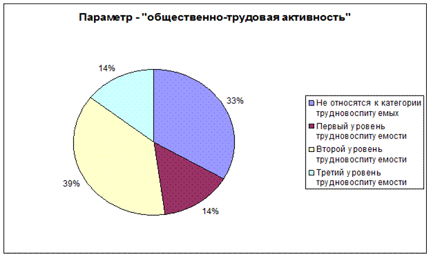 По параметру «общественно-трудовая активность» 33% учащихся не относятся к категории трудновоспитуемых, 14% имеют первый уровень трудновоспитуемости (дети имеют тенденцию к отклонению от общественно-трудовых поручений), 39% имеют второй уровень трудновоспитуемости (часто отклоняются от поручений, отсутствует интерес к общественной деятельности), 14% учащихся имеют третий уровень трудновоспитуемости (негативное отношение к поручениям, общественной деятельности).