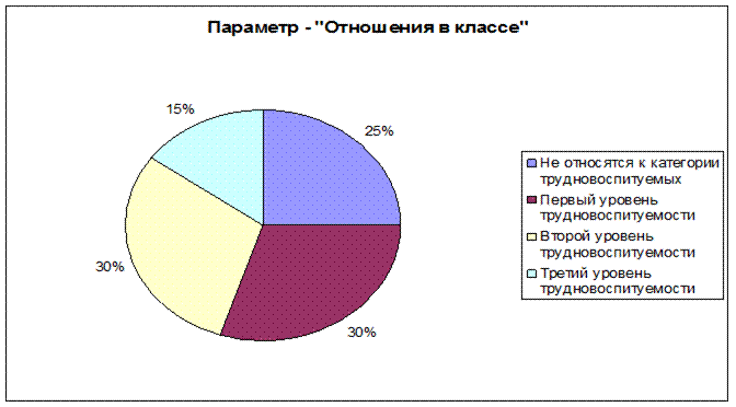 По параметру «отношения в классе» 25% учащихся не относятся к категории трудновоспитуемых, 30% имеют первый уровень трудновоспитуемости (отдельные конфликты), 30% имеют второй уровень трудновоспитуемости (ребёнок часто конфликтует с одноклассниками), 14% учащихся имеют третий уровень трудновоспитуемости (негативное отношение к сверстникам).