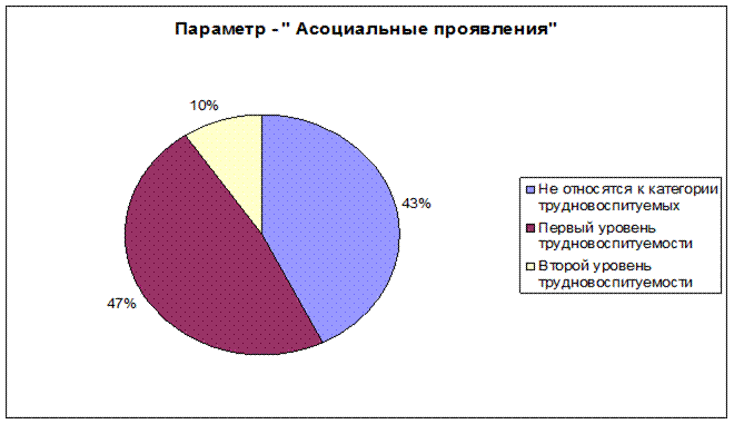 По параметру «асоциальные проявления» 43% учащихся не относятся к категории трудновоспитуемых, 47% имеют первый уровень трудновоспитуемости (неустойчивость, случайность отклонений в поведении), 10% имеют второй уровень трудновоспитуемости (имеются редкие случаи нарушения социальных норм).