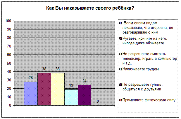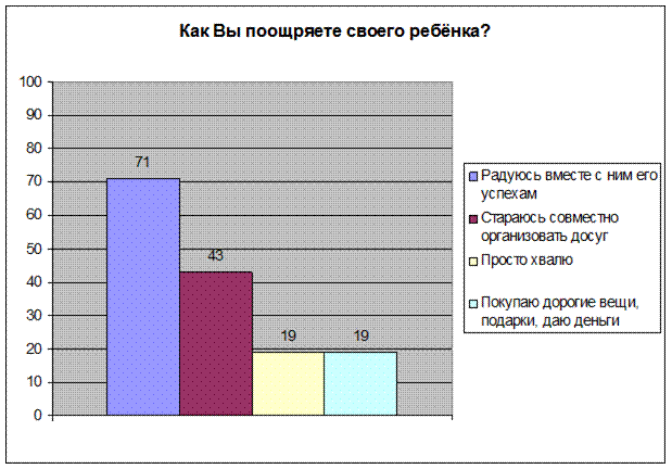 Для достижения цели исследования нами был разработан опросник для родителей на тему «Поощрение и наказание в воспитании ребёнка», результаты которого показывают, как родители применяют методы поощрения и наказания в воспитании детей.