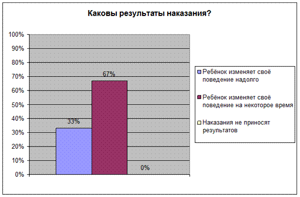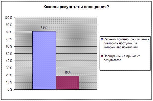 81% родителей отметили, что при использовании ими метода поощрения ребёнок стремиться повторить поступок, за который его похвалили. При использовании метода наказания дети в 100% случаев изменяют своё поведение (33% надолго, 67% на некоторое время). Таким образом, можно сделать вывод, что методы поощрения и наказания занимают значительное место в воспитании трудновоспитуемых детей.