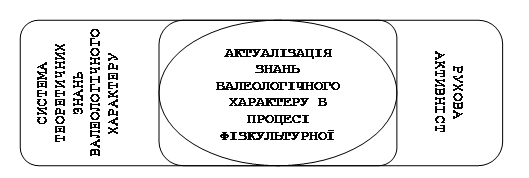 Комплекс методичних прийомів і нормативних документів реалізації системи валеологічних знань в умовах загальноосвітньої школи є смисловим поєднанням базового рухового матеріалу і валеологічного компоненту.