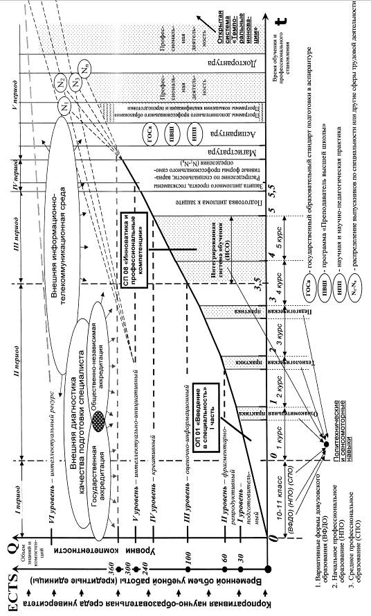 Научное образование мы относим к 5-му периоду непрерывной подготовки педагога – к открытой системе «темпоральные инновации», где первостепенную роль в совершенствовании профессионализма педагога профессионального обучения играют образовательные программы магистратуры, дополнительного и послевузовского обучения, программа «Преподаватель высшей школы», включая интегрированную систему технологической, профессионально-педагогической и научно-педагогической практики в соответствии с государственным образовательным стандартом подготовки аспирантов. (Рис.5)