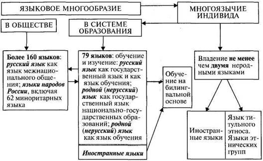Как известно, языковое и культурное многообразие России, одного из крупнейших полиэтнических государств, где проживают, по последним данным, 176 народов, наций и национальных групп, есть одно из исторических и культурных ее наследий (схема 1). По этому в понятие «языковое образование» граждан страны вкладывается широкий смысл — овладение наряду с родным и иностранными языками любыми неродными языками народов России (см.: Европейская хартия..., 1994; Красная книга языков народов России, 1994).