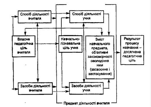 У процесі навчання об’єктом діяльності учителя (суб’єкта) є учень, клас, а предметом - навчально-пізнавальна діяльність (учіння) кожного школяра. Власне педагогічною метою діяльності вчителя є всебічний розвиток особистості учня, що досягається тільки в результаті навчально-пізнавальної діяльності дитини. Так, скільки учитель не розповідав би матеріал, але якщо учень не слухає, не мислить, не запам’ятовує і вольовими зусиллями не зосереджує увагу і т. ін., він не оволодіє цим змістом, не розвиватимуться його мислення, пам’ять, почуття, ставлення до навколишнього світу [6].
