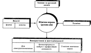При всій специфічності окремих розділів шкільної програми різних освітніх рівнів в основі абсолютної більшості занять з фізичної культури лежить вивчення фізичних вправ з метою збагачення рухового досвіду учнів, необхідного для успішної життєдіяльності. Суть вивчення рухових дій у всіх розділах програми однакова і може бути представлена схематично.
