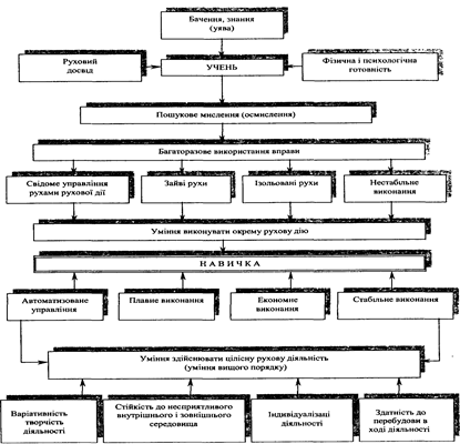 Формування умінь виконувати фізичні вправи, їх трансформація в навички, об'єднання навичок в уміння вищого порядку — це тривалий, складний процес, успіх якого залежить від багатьох чинників. Першим серед них є правильне педагогічне керівництво цим процесом, яке полягає у його чіткому структуруванні. У спеціальній літературі можна знайти інформацію яка свідчить, що різні джерела трактують структуру по-різному. Найбільше розбіжностей стосується кількості її етапів та їх змісту. Таку розбіжність, як показує аналіз, можна пояснити особливостями мислення авторів, контингентом учнів, для яких вона розробляється та специфікою виду рухової діяльності.