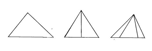 Поступово учні усвідомлюють, що відрізок може бути спільною стороною кількох многокутників і, спираючись на це, у 2-3 класах виконують вправи на побудову відрізків всередині многокутників так, щоб при цьому утворювались нові фігури; наприклад, провести всередині п’ятикутника один відрізок так, щоб у процесі розв’язування дістати трикутник і чотирикутник, або два чотирикутника, або трикутник і шестикутник (рис. 5). Учні виконують завдання в зошитах, а потім з’ясовують і демонструють на дошці різні розв’язання кожної задачі.