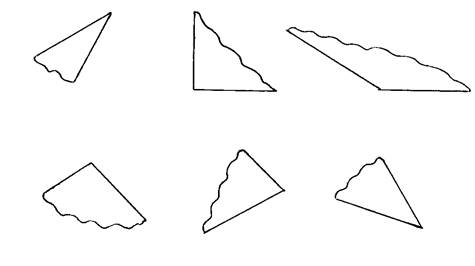 Потім діти накладанням установлюють, що незважаючи на різні аркуші паперу всі утворені прямі кути рівні. Користуючись моделлю прямого кута, учні знаходять прямі і непрямі кути на навколишніх предметах, зокрема на косинці. Потім, щоб установити вид кута, використовують прямий кут косинця (краще з прозорої пластмаси). Якщо кути збігаються (тобто збігаються їхні сторони і вершини), то цей кут прямий, якщо не збігаються - кут не прямий. Для закріплення уявлення про прямий кут розглядають спеціальні вправи. Наприклад, серед різних кутів пропонують знайти прямі кути (рис. 2);