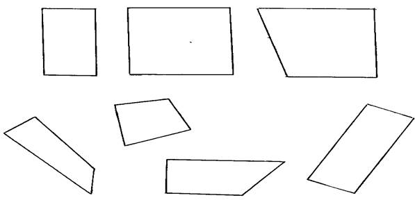 Для ознайомлення з прямокутником доцільно провести таку практичну роботу. Зобразивши два чотирикутники (один з них - прямокутник), запропонувати дітям відповісти на запитання, що спільного мають ці фігури, чим відрізняються одна від одної. Розглянувши їх, учні легко встановлять, що обидва - чотирикутні, а скориставшись моделлю прямого кута, з’ясують: у першої фігури всі кути різні, а в другої - прямі. Як інакше можна назвати другий чотирикутник? Якщо вихованці не зможуть відповісти, вчитель сам повідомляє: „Чотирикутник, у якого всі кути прямі, називається прямокутником’1.