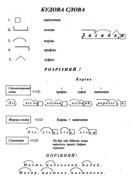Тому з першого і до останнього уроку слід зосередити увагу учнів на тому, що між словотвором і морфемною будовою слова існує принципова різниця, яку треба обов’язково усвідомити. Лише тоді, коли учні будуть чітко розмежовувати словотвір і морфемну будову слова, можна вважати, що обидва розділи засвоєно свідомо [ 14, с.64].