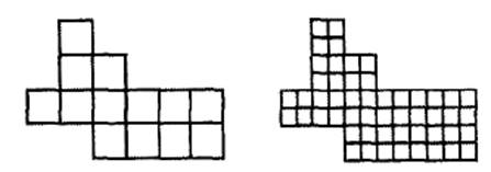 Способом підрахунку квадратів однієї і тієї самої фігури діти встановлюють, що вона містить різну їх кількість (13 і 52). Учитель підкреслює, що фігуру можна розбити на будь-які квадрати, але це незручно. Потрібно розбивати фігуру на квадрати із стороною певної довжини. Площі фігур визначають квадратними одиницями.