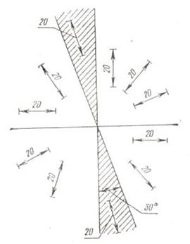 Цифри розмірних чисел при різних нахилах розмірних ліній варто розташовувати як показано на малюнку, уникаючи проведення розмірних ліній у межах кутів 30° і числа виносяться на лінії-винесення горизонтально.